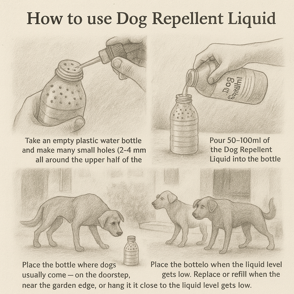 - Pour 50–100 ml of the Dog Repellent Liquid into the bottle.